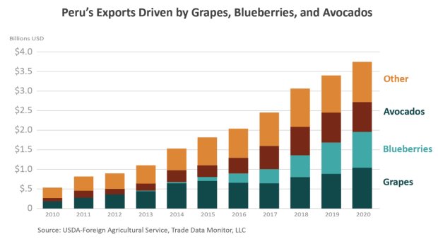 Grapes, blueberries, and avocados drive Peru’s fruit exports, followed by steady citrus and mango gains. In 2020, the United States and the EU-28 accounted for more than 75 percent of Peru’s exports, while China, Hong Kong, and Canada each account for about 5 percent.