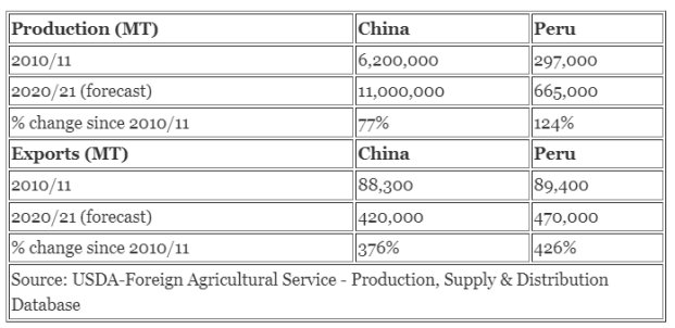 Exports have seen a similar rise, forecast up to 470,000 tons in 2020/21 and boosted export dependency to more than 70 percent. For perspective, even though China produces 16 times more grapes than Peru, both countries exported nearly the same amount for the past decade. In 2010, they both exported nearly 90,000 tons, and this parallel track has continued up to 2020.
