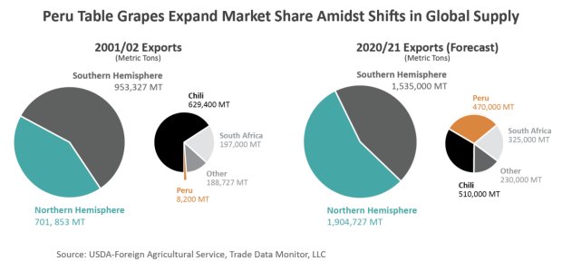 Peru overtook South Africa as the second-largest Southern Hemisphere supplier by volume in 2013, and it continues to make inroads on Chile’s market share. In 2001, Peru accounted for less than 1 percent (8,200 tons) of Southern Hemisphere shipments, compared to Chile’s 66 percent (629,400 tons) and South Africa’s 21 percent (197,000 tons). By 2019, Peru’s share had grown to 27 percent (399,800 tons valued at $937 million) while Chile’s had contracted to 40 percent (605,000 tons valued at $926 million) and South Africa’s slipped to 20 percent (297,8000 tons valued at over $500 million).