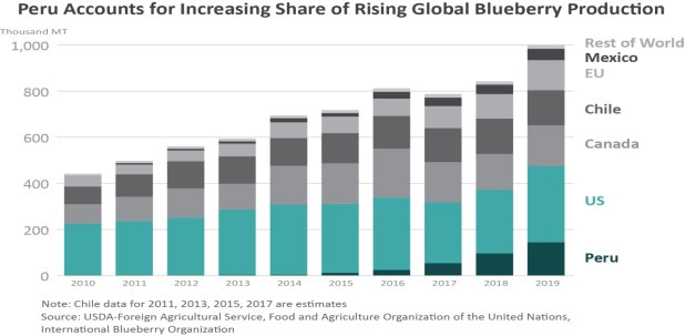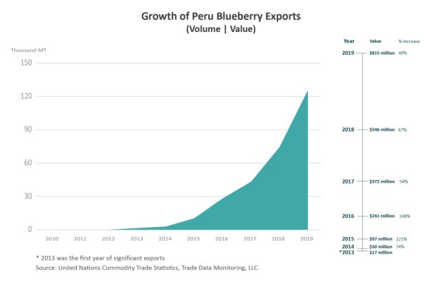 Production is almost solely for exports as high prices limit demand from domestic consumers. According to United Nations Commodity Trade Statistics, Peru started exporting fresh blueberries in minimal quantities in 2010. Between 2010 and 2019, both production and exports have grown from nearly zero to more than 140,000 and 125,000 tons, respectively, with 2019 exports valued at more than $800 million.